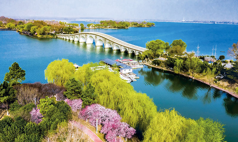 近年来,江苏省东海县积极践行“绿水青山就是金山银山”理念,湿地资源的生态、经济、社会效益逐步显现。图为2022年3月24日拍摄的东海县西双湖国家级湿地公园。自然资源部供图 邵光明/摄