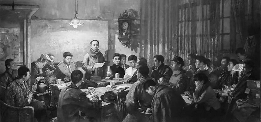 中共四大确立党的基层组织是支部。图为油画中共四大会场。