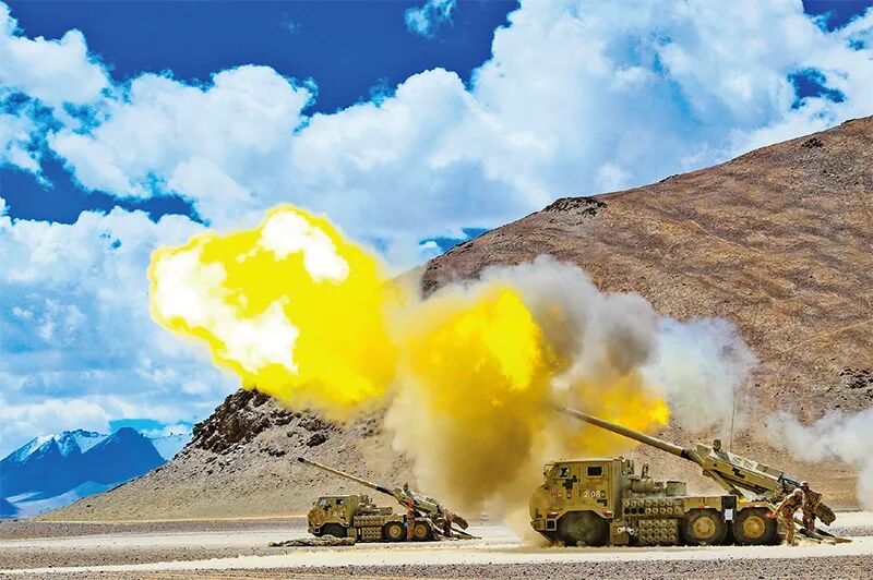 初夏时节,陆军某火力团展开多火器跨昼夜实弹射击演练。图为某新型火炮实施远程火力打击。陈明/摄