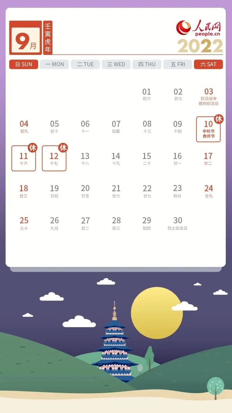 据中国政府网消息,国务院此前发布 《关于2022年部分节假日安排的通知》,2022年中秋节放假时间为9月10日(星期六)至12日(星期一)放假,共3天。