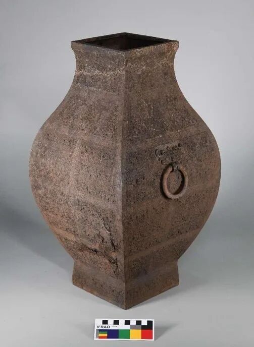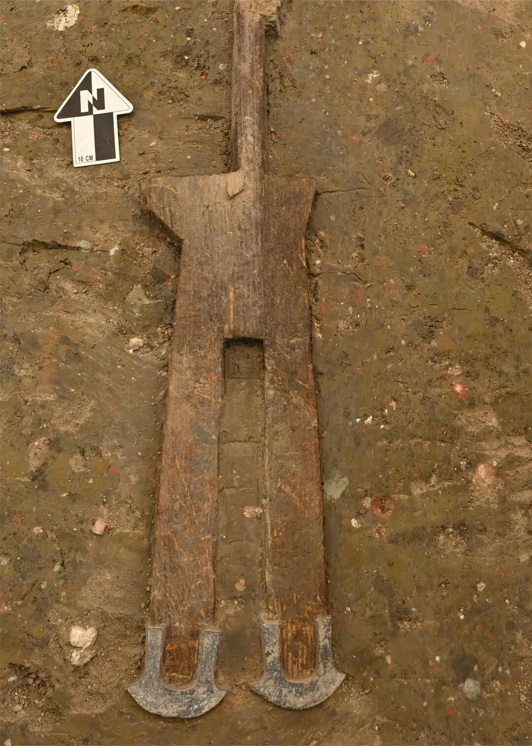 墓葬平面呈“甲”字形,方向为东西向,墓圹开口为正方形,边长约51米。开口层位距木椁室顶部15米。墓坑以东设有斜坡墓道一条,长约42米。填土层层夯筑,夯层厚度15-30厘米,每一夯层表面有密集夯窝。墓圹四壁有逐级内收的台阶共21级,形制规整(图三)。台阶表面涂抹有青膏泥,部分平面可见绳编草席压印痕迹。填土中出土遗物有铁锸、铁夯头、箭镞等。其中一件木柄双头铁锸,是目前出土的最具代表性、保存完好的带柄铁锸(图四)。
