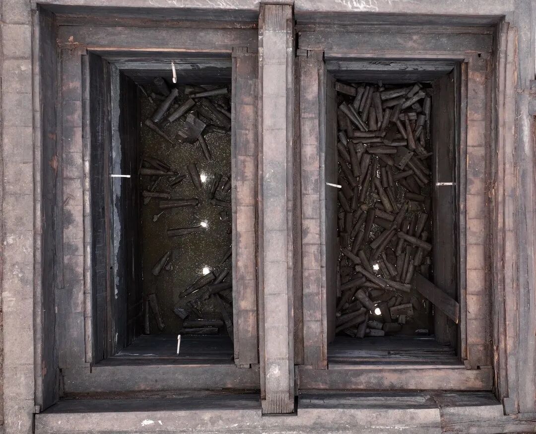 椁室清理过程中,先行提取了各椁室漂浮文物,以漆木器为主(图六、图七)。降水后,经文物保护专家现场研判,考古队同时开展了四个分室的清理工作,分别是东一室、北二室、西一室和西二室。东一室、西一室和西二室保存完整,北二室曾经受严重盗扰。从出土文物类别看,中室四周各侧室功能不同。东一室以铜礼器为主(图八、图九),有少量漆木器;西一室和西二室以木俑为主,有漆木车、乐器同出(图十);北二室有大量漆木乐器残块出土。在各侧室墙板的顶部,均有规律的镶嵌了“L”型石板(图十一),相同器物曾仅见于楚墓李三孤堆,用途不明。通过此次发掘,明确了其放置位置,基本可以确定是用作于悬挂帐幔类物品的钩型器,后期将通过对其表面附着的残留物进行采样分析,进一步明确用途。目前,椁室内已出土文物1000余件,其中铜礼器组合完整,漆木器数量、种类都是空前的。