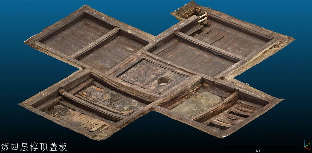 目前利用薄荷醇临时加固技术成功提取了覆盖于盖板之上的竹蓆,顺利提取443根椁盖板,完成了椁盖板和部分竹蓆的后期加固保护和抑菌防霉工作。对漆木器等脆弱文物,进行了现场加固后提取,并在实验室内进行精细化清理和稳定性保护。墓葬碳十四测年、木材树种鉴定、漆器和纺织品材料检测与工艺研究、墓葬埋藏环境分析等多学科研究工作正在同步开展中,已初步获得竹蓆和椁盖板的测年数据,确定了椁盖板树种、漆器表面显色物质成分、部分纺织品材质和工艺等,更好地支撑了考古研究和文物保护。