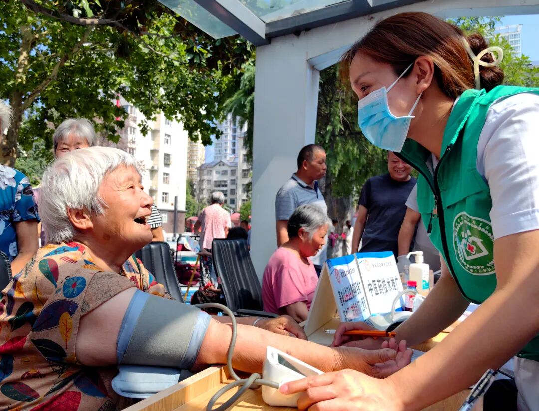河南省洛阳市洛龙区龙兴社区,洛龙区古城乡卫生院医务人员为老年人进行免费健康体检及开展公共卫生服务宣传。张光辉摄(影像中国)