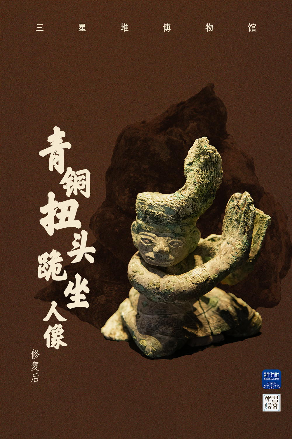 这是三星堆博物馆文物保护与修复馆拍摄的修复后的青铜扭头跪坐人像。