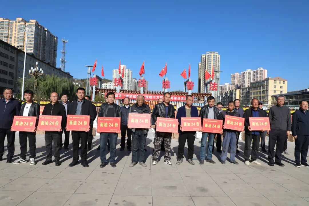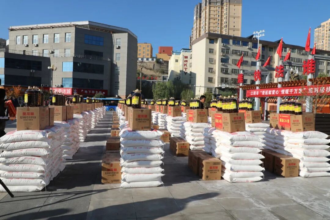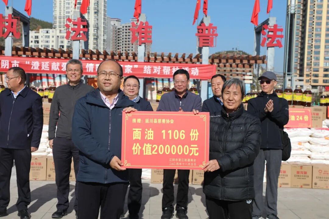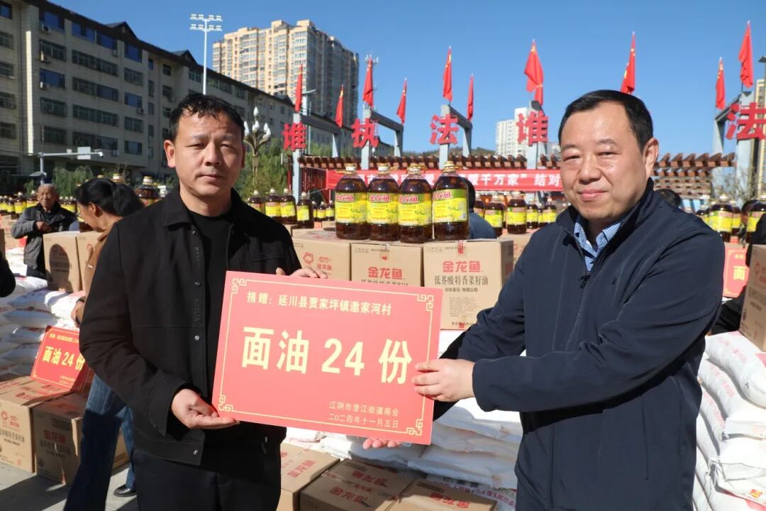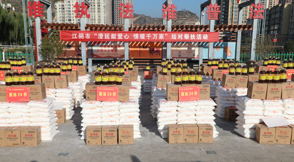 11月5日,2024年江阴市“澄延献爱心,情暖千万家”结对帮扶活动在延川县路遥广场隆重举行。江阴市澄江街道商会为延川县44个结对帮扶村的困难群众,10个慈善幸福家园共捐赠1106份爱心面、油,总价值20万元,让大家在严寒冬日深切感受到党和政府以及社会各界的关爱和温暖。充分体现了江阴市澄江街道积极推动“澄延协作”的政治担当,彰显了“澄延两地”的深厚情谊。