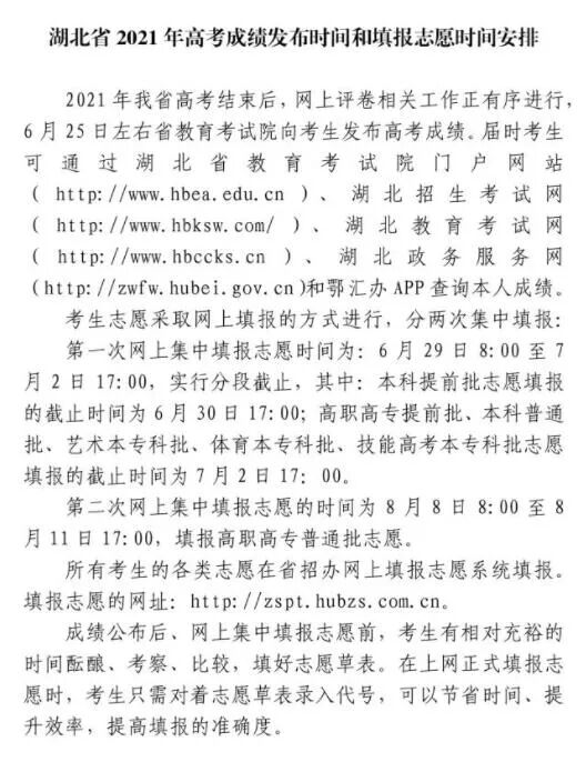 2021年我省高考已顺利结束,网上评卷相关工作正有序开展,预计6月25日考生可查询高考成绩。6月26日至6月27日,进行本科提前批A段军队院校集中填报志愿;6月28日至7月2日,进行本科提前批(除A段军队院校外)、本科批、对口本科批集中填报志愿;7月27日至7月30日,进行专科提前批、专科批、对口专科批集中填报志愿。录取工作将从7月上旬开始,至8月中旬结束。