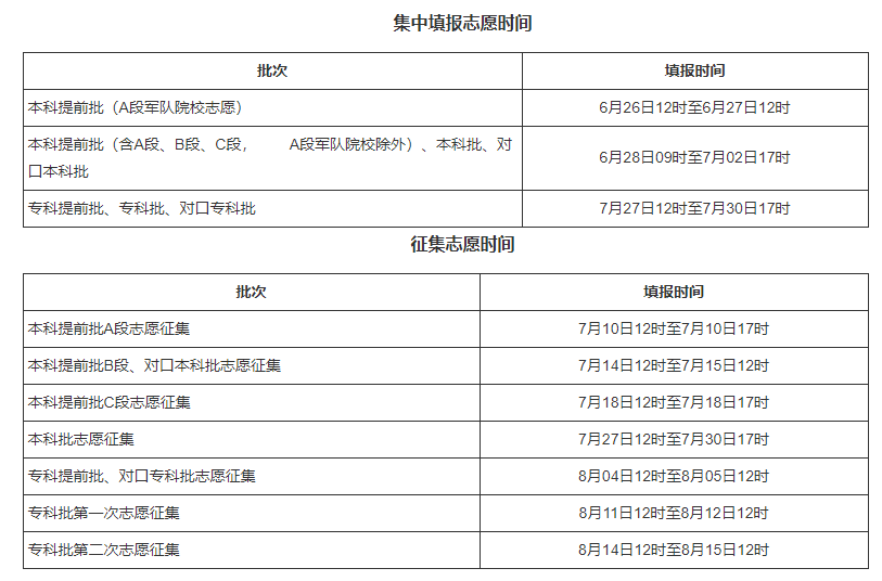 今年,我省高考志愿填报分两次进行。第一次志愿填报时间为6月25日20时至27日20时;第二次志愿填报时间为8月5日20时至7日14时。高考录取工作将于7月5日开始,8月19日结束。